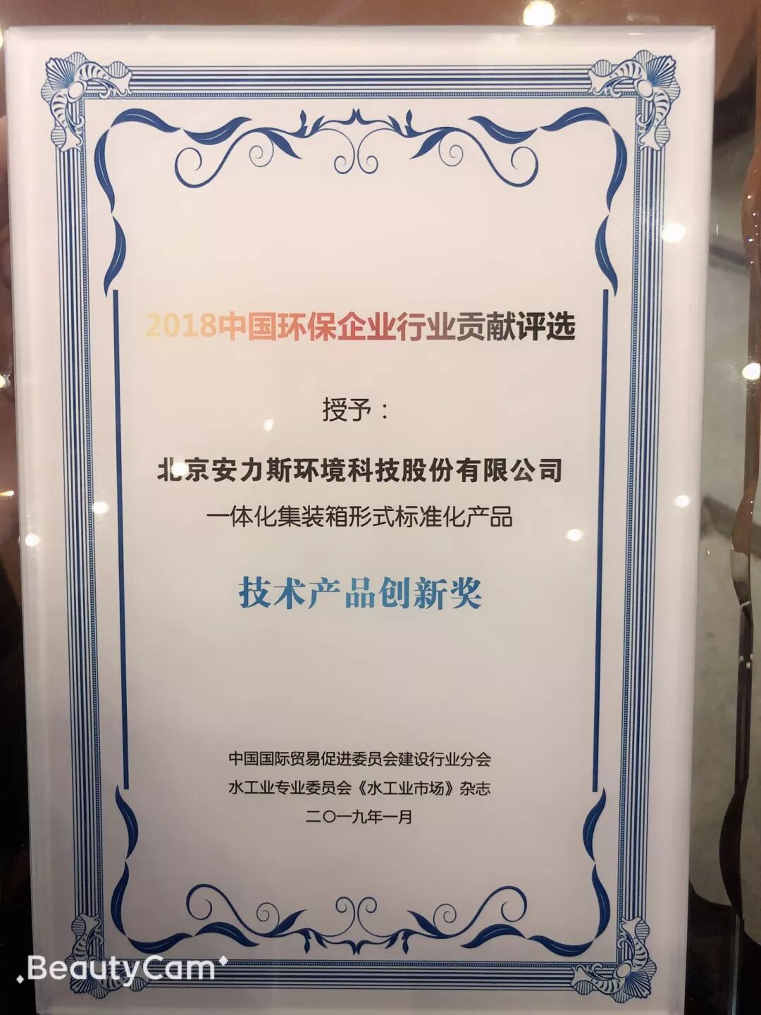 20193月21-22日,由《水工业市场》杂志主办的“2019(第14届)水处理行业热点技术论坛”在中国人民大学成功举行。其间,“2018中国环保企业行业贡献评选”榜单隆重揭晓,并举行了颁奖仪式。安力斯开云手机在线登陆入口凭借“一体化集装箱形式标准化开云(中国)”荣获“技术开云(中国)创新奖”。